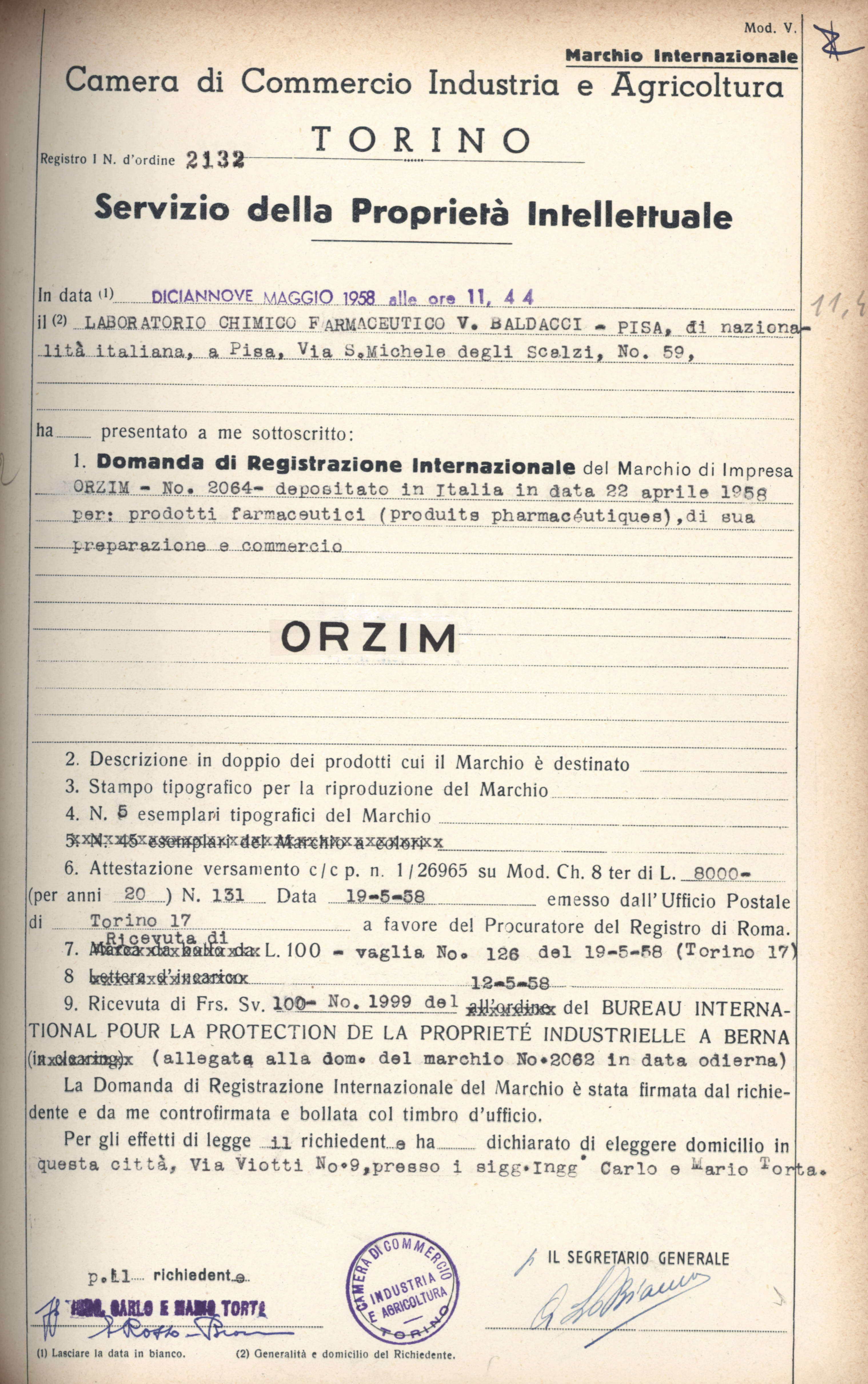 DescrizioneDomanda di registrazione internazionale del marchio di impresa - ORZIM - N. 2064 - depositato in Italia in data 22/4/1958, per prodotti farmaceutici (produits pharmacéutiques), di sua preparazione e commercio