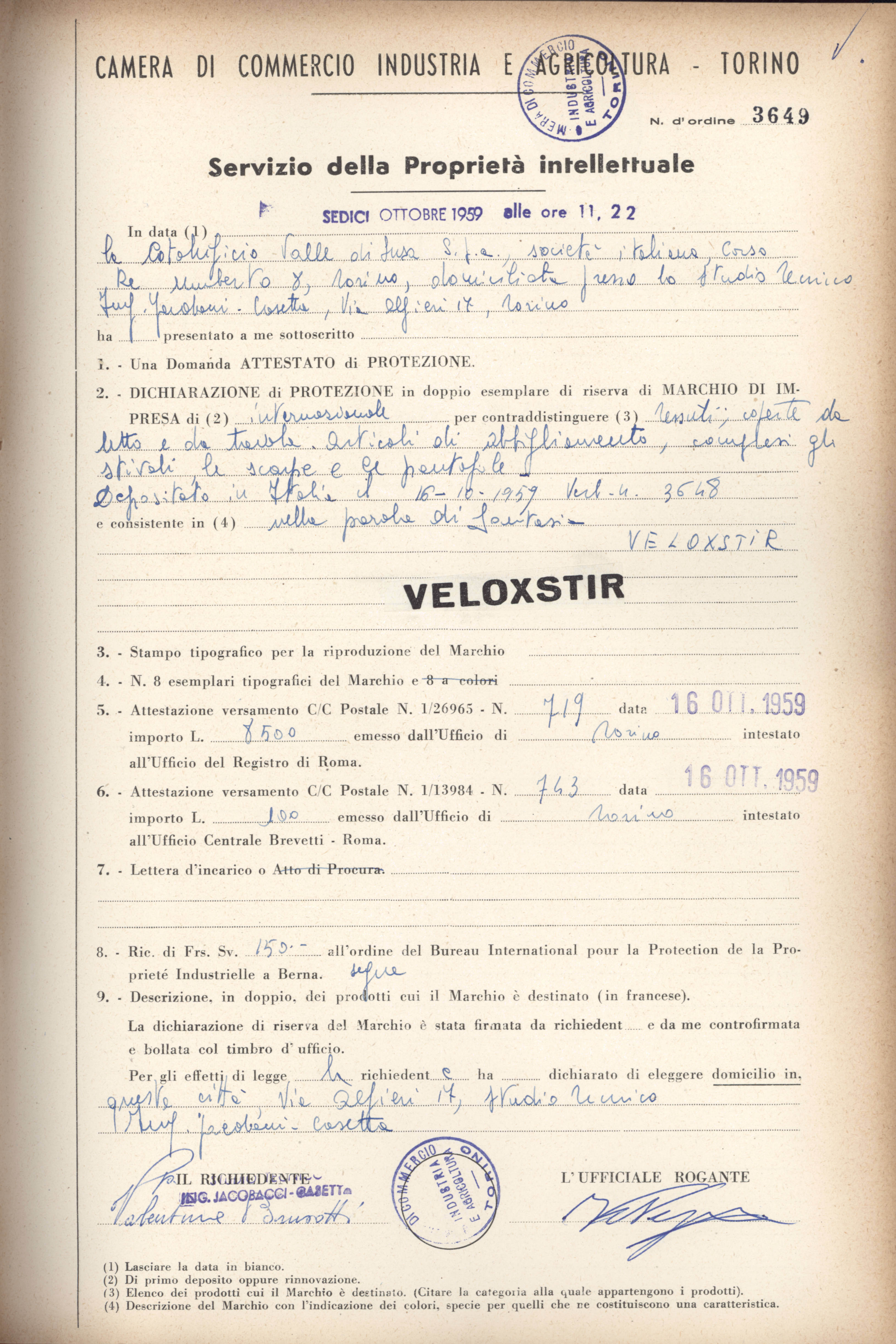 Domanda di registrazione internazionale del marchio d'impresa depositato in Italia il 16/10/1959 verbale n. 3648 e consistente nella parola di fantasia - VELOXSTIR -