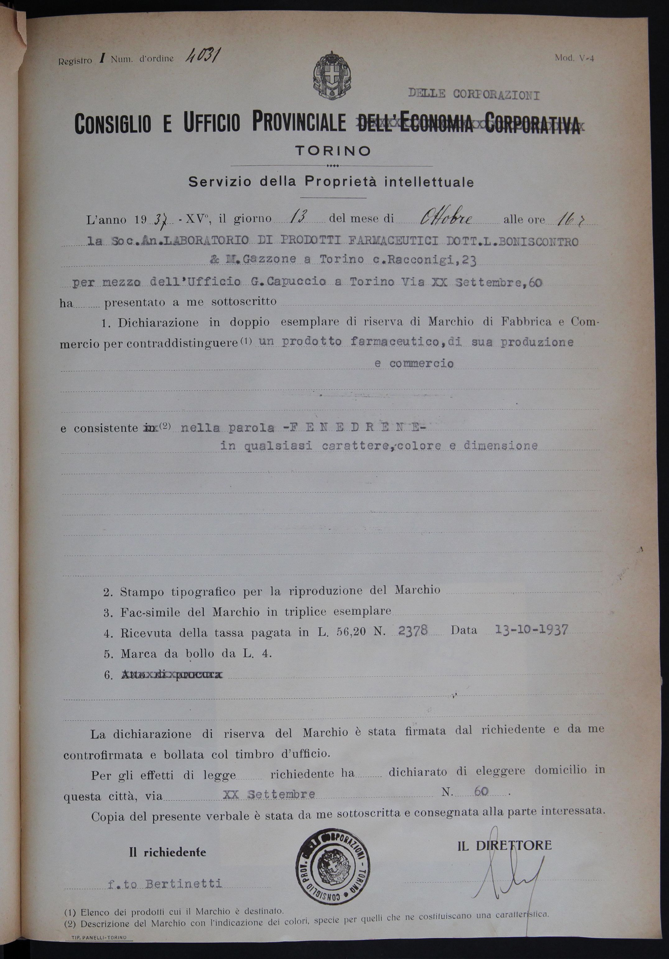 Ufficio riceventeConsiglio e Ufficio Provinciale dell'Economia Corporativa - Torino - Servizio della Proprietà Intellettuale